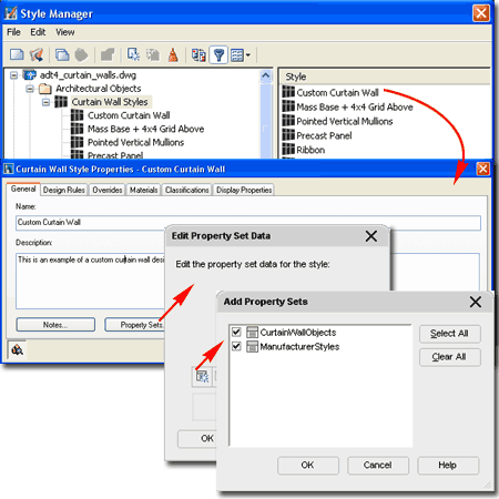 ![]() On the General Tab of the Curtain Wall Style Properties dialog, you will find a place to modify the Name, add a Description, add Notes... and Property Sets... If you intend to use the Schedule Tags and Schedule Objects in ADT, you must use the Property Sets... button to Add the appropriate Property Data. Data can be added for expanded Schedules or additional Schedule Styles and you can even create new Data Sets but let's put that topic off to Part 18 - Schedules. Illustrated above, I show that ADT comes with one example Property Set for CurtainWallObjects that you may want to experiment with to see the type of data you can extract from one of these Object Types. |