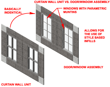 The really significant difference between Curtain Wall Units and Curtain Walls is that the Units do not allow for Style Based Infills so you can't create Curtain Wall Units with Doors, Windows, Assemblies or other Curtain Wall Units. What I recommend is that you consider using Door/Window Assemblies as Infills whenever you need to include Doors and/or Windows. |