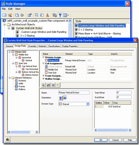 For Curtain Wall Unit Objects, you can use the Style Manager to load, modify, delete and create new Curtain Wall Units Styles. Illustrated to the right I show how a Curtain Wall Unit basically offers all of the same settings and options on the Design Rules tab of the Style Properties dialog as Curtain Wall Styles. |