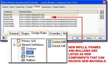 Illustrated to the right I show that all Curtain Wall Styles offer three Default Components under the Material tab: Default Infill, Default Frame and Default Mullion. If you create New Infill, Frame and/or Mullion Element Definitions they will automatically be listed as new Components under the Materials tab. This means that should you need unique Material characteristics such as different Frame Materials for example, you can define New Frames for each side of the Curtain Wall. You can also use this feature to create Infills that are Glazed, Metal, Wood or any other Material. Since Materials can also be used to control line properties, you may want to use an existing Curtain Wall Style as the source for any new ones you create. |