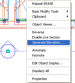 Though this command can be activated by typing or creating a custom tool, the easiest way to Regenerate is to Select an Elevation Object ( not the Elevation Line Object ), right-click on the mouse and select Regenerate... off of the object-specific pop-up menu - illustrated left. You can only Regenerate one Elevation Object at a time but you can Refresh as many as you wish to Select. When Regenerating, the Generate Section/Elevation dialog is used and just about all of the options, conditions and results are the same. You can even create a New Elevation by Regenerating an existing one ( just use the New Object and Pick Point buttons ). This means that you really only need to use this tool when working with 3D Elevations ( which I never do ) and when you need to Save 2D Linework Edits to a New Style and/or change the Selection Set. For most other forms of updating, use the Refresh option discussed below. Note: |