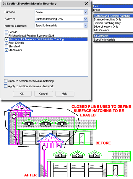 The concept is fairly simple to grasp: you draw a Closed Polyline shape over your 2D Elevation or Section and use it to "Erase" or "Limit" the whole or portions of it. Illustrated to the right I show a Before and After shot of a simple 2D Elevation Object with Surface Hatches across most of it. In the Before shot, I show a Closed Polyline that can be used to Erase or Limit any or all of the Linework and Hatches. On the 2D Section/Elevation Material Boundary dialog, also illustrated to the right, I show that I made specific choices for Purpose, Apply to and Material Selection in order to produce the results illustrated by the After shot. Purpose - this drop-down list offers the ability to use the Closed Polyline as a Boundary that Erases the objects within it or Limits them from going beyond it. Apply to - this drop-down list has five different options for what the Closed Polyline will affect: Surfaces and Section Hatching, Surface Hatching Only, Section Hatching Only, Edge Linework Only and All Linework. In the Before and After shots, I used the Surface Hatching Only option to only affect the Hatch Patterns but you can use the All Linework to create a Crop or Clip effect. Material Selection - this drop-down list offers the option to choose which Materials you want the Closed Polyline to affect. By setting this drop-down list to "Specific Materials", you open up the Materials List below it and are thus able to specify the Materials to be affected. This means that you can, for example, "Erase" a Brick Hatch Pattern while leaving a Spanish Roof Tile Hatch Pattern unaffected though it resides within the Polyline. Apply to section shrinkwrap hatching - 2D Sections - see PART 15 - SECTIONS AND LIVE SECTIONS Apply to section shrinkwrap linework - 2D Sections - see PART 15 - SECTIONS AND LIVE SECTIONS |