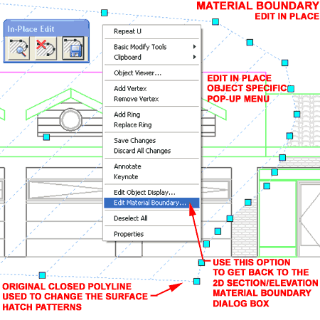 By using the options on the object specific pop-up menu, you can Add or Remove Vertex Points, Rings and even change the Display Properties of the Boundary as it is displayed in the "Edit in Place" mode ( that's wild, isn't it ). Of the group of options on the object specific pop-up menu, the one you are most likely to desire is the Edit Material Boundary... option which takes you back to the 2D Section/Elevation Material Boundary dialog box used to create the Boundary in the first place. |