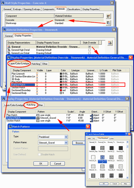 1) Use the Style Properties dialog box to access the Style's Materials tab. 2) Add a New Material or Modify an existing Component Material. 3) On the Material Definition's Display Properties tab, use an Override for the Display Representation being used to Generate your Elevation Object(s). In the illustration to the right, I show that I have added an Override on the General Display Representation because that is what my Wall Style is using in the default 2D Elevations. If in doubt, you can add Overrides to as many of the Display Representations as you think you need to. The Overrides are necessary because the Material Definition, like object styles, uses the same Display Representations for all cases of use; i.e., if you don't use an Override and set it to Bricks, that will become the default Hatch Pattern for the current Display Representation and you could end up with Bricks where you don't want them. 4) Once you activate the Style Override, you should be taken to the Display Properties dialog for the Material Definition Override. On this dialog, you should find that the Surface Hatch Display Component on the Layer/ Color / Linetype tab is turned OFF by default. Turn this Display Component ON. 5) To set the Hatch Pattern for this Material Definition, use the Hatching tab on the Display Properties dialog ( same dialog as in step 4 ). For the Surface Hatch Display Component, pick on the Pattern field ( image icon ) and you should see the Hatch Pattern dialog where you can use a Predefined Pattern Name ( use the Browse... button ) to set a really nice pattern. 6) Close All dialog boxes and Refresh any existing 2D Elevation Objects to see the new Surface Hatch Pattern. |