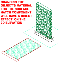 In Section 9 we will look at the use of Hatch Patterns across 2D Elevation Surfaces. For Rendering topics, see the Architectural Desktop Presentation eGuide. For 3D Elevation Objects, since there is no Style that controls their Display Properties, their Display is derived directly from the Model Display Representation and thus whatever Materials it is set to use, are the Materials that you will see in the 3D Elevation Object. For 2D Elevations Objects, there are several Display Property controls that all have to work together in order to get proper results. Illustrated to the right I show that the Layer/Color/Linetype tab of a 2D Elevation Object's Display Properties has a Surface Hatch Linework Display Component that you can turn On or Off. If you don't have any Surface Hatching assigned to the actual Objects from which the 2D Elevation was derived, you will not be able to add it here. Basically the you will need to decide on how you want to control the Display Properties of the Surface Hatch: By Material or by the options on this tab ( such as Color ). |
