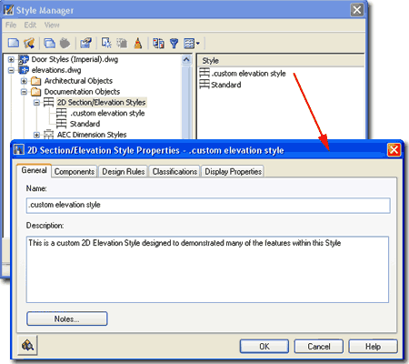 For 2D Section objects, you can use the Style Manager to load, modify, delete and create new 2D Section Styles. Illustrated to the right, I show the process of creating a New 2D Section Style that I have Named "Custom Elevation Style". By double-clicking on this new style, you will invoke the 2D Section/Elevation Styles dialog box - as illustrated. The General tab provides access to the Name and Description fields for a Style; plus access to the attachment of Notes and Property Sets. |