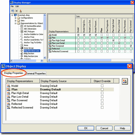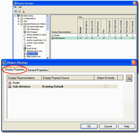 Display Representation Sets for Elevations and Sections If you don't choose the right Display Representation Set when you generate an elevation or Section, the objects generated in the automatic elevation or Section may not come out right. For example, you might only see a single horizontal line in a Section view if you chose the PLAN Display Representation Set. These Display Representation Sets tell ADT how to represent your Doors, Windows and other objects in an elevation or section as opposed to a plan view. A door, for example, will have a frame with a swing triangle in an elevation but not in a plan. If you recall, Display Representation Sets are actually groups of all the Display Representations; one for each Object Family. |
