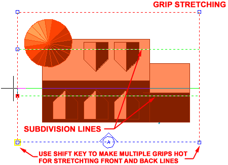 | Modifying a Section Line with Grips When you Select an Section Line Object, you should see several Grip points activate that you can use to edit with. These Grip points correspond to the values that you set on the Properties Palette for an Section Line Object. Grip Stretching Subdivision Lines is as easy as it gets because you only have one Grip to work with. Grip Stretching any of the four corners of a Section Line Object may pose more of a problem. Since the Section Line Object supports irregular shaped tetragons, you can stretch any corner uniquely. If you don't want an irregular shape, simply use the Shift key while making your Grip spots HOT. This will allow you to work with two Grips at the same time and thus you can Grip Stretch one side evenly to exclude or include more of your project.