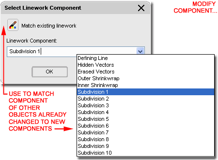 The Modify Component... option activates another dialog box, illustrated right, that provides an unusual way to edit linework that is embedded within the Section Object. Because the Section Object is "live-linked" to the source model, edited linework must be saved in a unique way in order for that edited work to be regenerated in the future. Unfortunately this aspect of editing linework for Section Objects is thus tedious and time-consuming so you may want to solve editing needs another way ( see comments below under Summation). The Match existing linework option on the Select Linework Component dialog box allows you to use a tool like Property Painter to capture the Component of other linework in the current Section Object and apply it to object(s) being edited. |