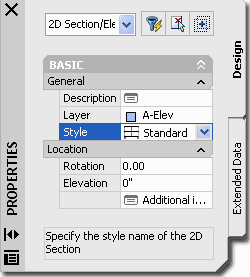 Since Section Objects are fairly simple with respect to options, the Properties Palette will reflect this fact. For 2D Elevations and Sections, you can change the Style and for 3D Elevations and Sections, you can only change position based items in the Location Field since 3D Elevations and Sections have no Styles. You may want to use this button to provide a Description, Attach notes and Property Sources. |