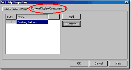 On the Components tab of the 2D Section/Elevation Styles dialogue box you can use the Add button to create custom Component names for use on the Design Rules tab and on the Layer/ Color/ Linetype tab of the Entity Properties dialogue box. The basic concept behind this option is to allow you to define Layer/ Color/ Linetype Component Names that you can use to assign custom Layers, Colors and/or Linetypes for objects within your Section. Illustrated to the right, I show that I have Added two unique Components named for what I intend to used them for: Plumbing Fixtures and Doors. Follow the discussion below and you can see how I use these Components to change the line colors and weights of objects within a Section object. |