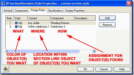 On the Components tab of the 2D Section/Elevation Style Properties dialog box you can use the Add button to create custom Component names for use on the Design Rules tab and on the Layer/Color/Linetype tab of the Display Properties dialog box. The basic concept behind this option is to create a "filter" that finds objects within your Section Line that match your specifications for Color and Context. Using this "filter" you can have the Design Rules look for objects that have the Color 150, for example, and lie in the closest front portion of your Subdivided Section Line, change to one of your custom Component Names ( these are created on the Components tab ). Illustrated to the right, I show that I have Added two unique Design Rules. Rule 1 finds objects in my example Model whose Layer is set to a Color of 140 and lie Anywhere ( Any Visible) within my Section Line and assigns them to the custom Component Name "Plumbing Fixtures" that I created on the Components tab. Rule 2 finds objects in my example Model whose Layer is set to a Color of 150 and lie Within Subdivision 1 of my Section Line and assigns them to the Component Name "Subdivision 3" that I intend to set to a specific color later on the Component Layers. Note: Rule - an index number automatically generated to assist in tracking. Color - use the Select Color dialogue box to set the color of the objects you are filter for ( not against ) If you want to change your Walls and you know they are set to Color 50, then you set Color to 50. |