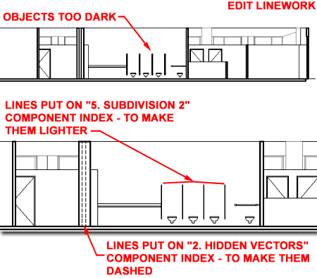 ![]() Context - use the drop-down list to help filter for objects you set by Color. You can use Any visible or Any visible or hidden to work with your Color selection to find all instances of objects with that Color. You can also refine your filter by specifying that you only want objects within a particular subdivision ( as illustrated ). This is how you can make Walls closer in an Elevation or Section darker than those beyond - even if they are in the same Subdivision. Component - use the drop-down list to specify what to do with the objects that have been filtered for by the Color and Context options. Component Display, if you realize by now, is controlled on the Layer / Color / Linetype tab of the Entity Properties dialogue box for a particular object or object Style. Using the pre-defined "SubDiv #" choices is okay as long as you pick numbers out of your range for the physical subdivisions that you may have on your Section or Section Line object. You can also use unique Components, as illustrated with "Plumbing Fixtures", by first creating them on the Components tab of this dialogue box - see below for how to change their colors. |