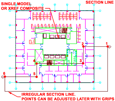 Adding a Section Line is a far easier task than figuring out how to put a project together to take advantage of this tool. It's also based on all of the same principals used to create an Elevation. Illustrated to the right, I show the plan view of a highrise with the six two points that were used to create an irregular Section Line ( see red numbered dots). Once you have finished picking two or more points to establish where you want your section line to cut through, hit the <Enter> key to establish the Length of the bounding box. Whatever values you set at this stage can always be changed later so it is not required that you be exact about these points. The Section Bubble is more of a tracking tool for you than for proper annotation; though you can certainly use it as a proper annotation symbol. There are better Section Marks in ADT that you can access from the Annotation tab of the Tool Palette or go to the Elevation Marks folder under the Documentation folder in the Design Center (type "_AecDcSetImpSectionMarks" or "_AecDcSetMetSectionMarks" for Metric). For multiple Sections, you can draw a Section Line for each side or Copy one Section Line object, Rotate it and position it as you like. |