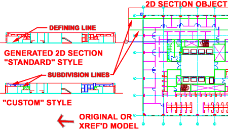 Result Type 2D Section/Elevation Object with Hidden Line Removal - a projection on to a plane of your drawing where subdivisions and other Section Line settings are displayed. You can think of this as being much like a block or Xref associated with the Section Line and your original drawing. If exploded two times, you will get 2D line work. Style