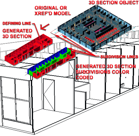 Properties - 3D Section - Component Layers - Example Illustrated to the right I show the default 3D Section Object and how the same 3D Section object can be adjusted to reflect the Color changes for the Subdivision lines on the Section Line object. To change the Colors, as illustrated, select the 3D Section object, right-click and use Edit Object Display... as outlined below. Notice that for a background, I show what the multicolored 3D Section object might look like when plotted in black and white. If find these particularly useful, even more so in perspective as shown, to help communicate internal design features that don't show up well in full isometric or perspective views. In a way, you get quick interior Sections this way.