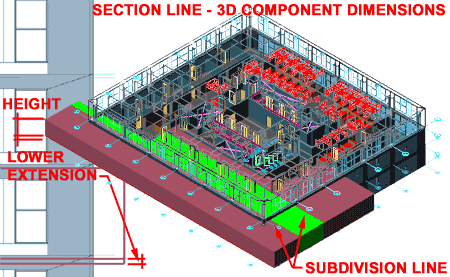 Subdivisions - when you pick on this cell, you will activate the Subdivisions dialog box where you can Add, Edit or Remove Subdivisions Lines. Subdivisions are measured from the Elevation Defining Line in and represent sectional divisions where you want the lineweight/color to vary. In other words, adding a Subdivision half way along your Elevation Boundary box will allow you to change the colors, linetypes and lineweight of all the lines/objects that lie beyond the subdivision line. Lower Extension - (Use Model Extents for Height must be set to No) - an amount of space extended below the default ground plane for an Section Line. The default will capture information that lies 12 inches ( 308 mm ) below the World Coordinate System or Ground Plane. Illustrated to the right, this option is used to capture the slab below the finished floor in a high-rise building. Component Dimensions B Side 2 - similar to A Side 1. |