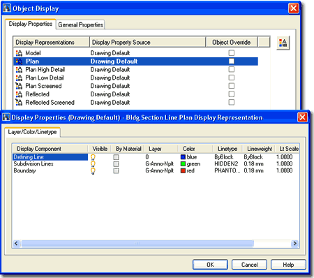 Section - Component Layers On the Layer /Color /Linetype tab of the Display Properties dialog box, illustrated to the right, you will find the power to control the Color ( and consequently Lineweight for Color Dependant Plot Tables or .CTB files ), Layers, Linetypes, Lineweights, Lt Scale, Plot Style ( for .STB Plot files ) and Visibility. The By Material option is not available for this Display Representation. Illustrated to the right I show that I have Attached an Override for the 3D Section/Elevation Entity Property Source since I want these changes to be reflected on this 3D Section object only and not all 3D Section and Section objects in my drawing. Defining Line - is the default color of your 2D Section but is primarily designed for the outline of a Sectional Cut right at the defining point of the cut. If you have and use the Subdivisions, this Component Color will not matter. Subdivision 1 - 10 - a default set of subdivisions that are automatically associated with physical subdivision lines on your Section or Section Line object. |