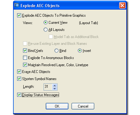 blocks Reuse Existing Layer and Block Names - this option still leaves me with questions so I won't elaborate beyond my understanding. Apparently, if you intend to run this routine more than once, you could end up with redundant layers so here you can set it to re-use existing layer names. This has to do with Viewport Mapping of Layers. You can read up on it in the ADT Help menu - search for Explode AEC Objects. To explore how this works, run it once for one "Current View" and then return to repeat and should find that you can now "Re-use Existing Layer and Block Names" for the next run. Bind Xrefs - this option is the same as