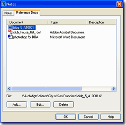The Reference Docs tab of the Notes dialog, illustrated left, box is far more interesting and useful than the Notes part. By using the Add... button you can access your hard drive or Server and link an unlimited set of file types to the current object. As illustrated, I show that I have Added a drawing, video, photo and document. The problem with both options is that we tend to forget what we don't see and I think in order for either of these options to be useful, a visual queue is needed so that we remember that information has been added. It is possible to create such a visual queue by using all sorts of tricks but we would want one that does not print ( or has that option ) and I would prefer one that isn't a vector object so I don't end up snapping on it by accident. |