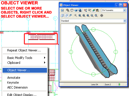 The Object Viewer is one of my favorite tools in ADT and when I find myself in regular AutoCAD, I really miss this tool. You may have discovered that the 3D Orbit tool often behaves poorly with respect to the center of the objects on your screen. For cases where this happens, just Select your objects and use this tool instead because it always has the correct center. If you want to use it as a replacement for the regular 3D Orbit tools, use the Ctrl+A keyboard stroke before activating the Object Viewer so you will see All Objects in it. Notice that is has several ADT only tools such as, Display Configurations, a Set View option and the ability to set the Lens Length in millimeters ( like a real camera ). Illustrated to the right, I show how you can use the Object Viewer to select a set of objects in a complex plan and view it in an isolated mode. The Object Viewer has all of the same options as those found when using the 3D Orbit tool; just pick the 3D Orbit button and right-click to see the full list of options. You can also use the tools from the toolbar to achieve similar results as those found off of the 3D Orbit pop-up menu.