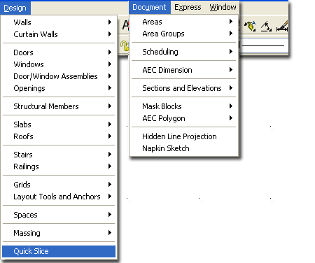 Quick Slice is the ultimate 2D projection tool in ADT but that does not mean it is the best solution for creating sections. This is the type of tool you use when you have a very specific need or are completely frustrated with all of the other options ( thus needing the ultimate end ). Quick Slice is similar to the Slice tool in AutoCAD for Solid Models and creates a 2D Polyline right through the Selected Objects. It uses the ZX-plane of the UCS icon as a basis for what plane to slice in so you can actually use Quick Slice to create 2D polyline representations of Floor Plans. To cut a 2D Floor Plan, simply rotate the UCS icon on the X-axis by 90 degrees. It will slice through most ADT Objects, including Mass Elements and it will also slice through AutoCAD Solid Models. Though Quick Slice will cut an Xref'd model, it does seem to perform better if the objects are in their original state rather than within an Xref. Another thing to keep in mind is that Doors are, by default, open on Models and thus will not show up in a Quick Slice unless closed. |