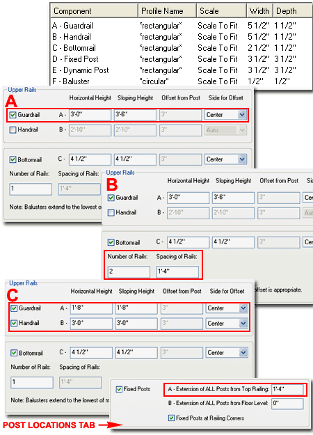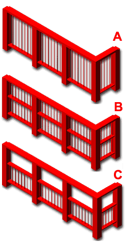 Illustrated to the left and right I show some simple examples of how you can play with the different components within a Railing Style to produce unique design results. For Railing "A", I show that the Guardrail Component is used to control the Post and Baluster height. For Railing "B", I show how a slight modification to the same Railing Style will produce horizontal members between the Bottomrail and Guardrail. These horizontal members are actually copies of the Bottomrail Component. For Railing "C", I show how you can use the Guardrail and Handrail Components to alter how the Balusters appear while keeping a similar Railing design solution. To shorten the Balusters, I reduced the Guardrail height to about half of the original height and set the Handrail to the former height of the Guardrail. In essence, I am using the Handrail as a Guardrail. The problem with this trick is that the Guardrail also affects the height of the Posts but I have another trick for that; on the Post Locations tab, compensate for the reduction in Post height by adding it back as "A - Extension of ALL Posts from Top Railing". I |