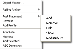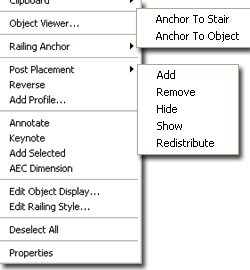 ![]() Anchor - this dialog box provides the option to change the original Justification to Left, Right or Center and another place to change the Side Offset value as discussed above. Post Placement is typically Automatic but can be set manually by using negative or positive values for "B - Start Offset" and "C - End Offset". If you move the first and/or last post position you may also want to have the remaining Posts and Dynamic Post positions redistributed based on the specifications within the Railing Style; use the "Redistribute Posts" checkbox for this feature. Illustrated to the left I show the object-specific pop-up menu and the options you have for an un-Anchored Railing Object. In addition to these options, you will find some flexibility for controlling the design of Railing through the use of Grips. |
