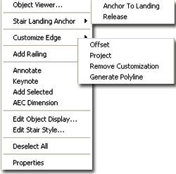 ![]() Additional information - use this dialog box to check for erroneous coordinate settings such as improper Z-axis values or to set unique position, scale or rotation values. This option is not available on Stairs that have been Anchored to Landings. Anchor - this dialog box is only available on Stairs that have been Anchored to other Stairs with the AnchorToStairLanding tool - see below for more information on this subject. For Worksheets and other options on this Palette, see the discussion under Adding Stairs for more information. Illustrated to the left I show the object-specific pop-up menu and the options you have for a Stair Object. In addition to these options, you will find a great deal of flexibility for controlling the design of Stairs through the use of Grips. |