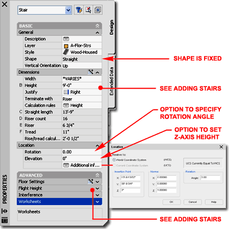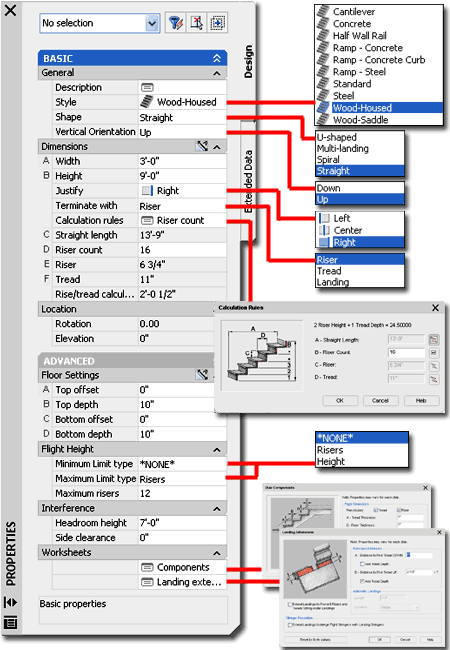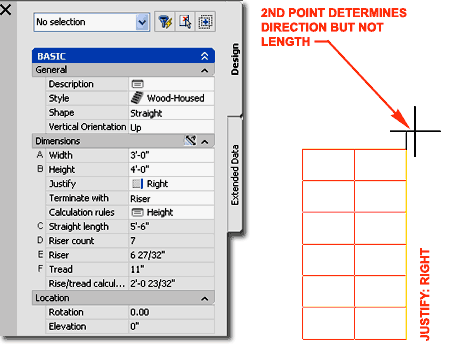 settings but you can release as many as two automatic settings at a time and One good example of when to use this option is when you are drawing a Stair from an existing condition that you measured on-site. You may need to manually set a known Riser height or Tread depth based on those known values. If both come out incorrect no matter what you do, you will probably need to change the Code Limits on the Design Rules tab of the current Stair Style. C or A - Straight Length - a way to change the full length for a flight of stairs that is similar to using Grips to change the length. When you release this value field, you can only release the Riser Count at the same time. Since changing this value often produces dialog alerts and even Defect Warnings, you may need to uncheck the "Use Rule Based Calculator" option on the current Stair Style's Design Rules tab in order to use this option more effectively. |