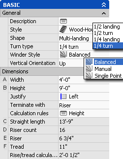 For Modifying Stairs you can use the Properties Palette which offers nearly all of the same options as those found when Adding Stairs. Once you have created a Stair in a drawing, you cannot change its Shape so you may be disappointed when you notice that this drop-down list is now gray. You should find, however, that all of the other options are available for you to modify and you can now use the Rotation, Elevation and Additional information options as well.