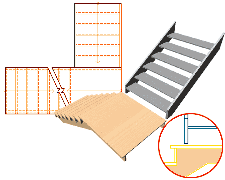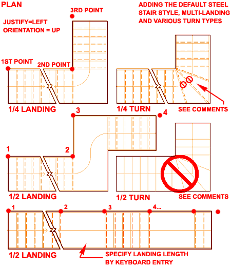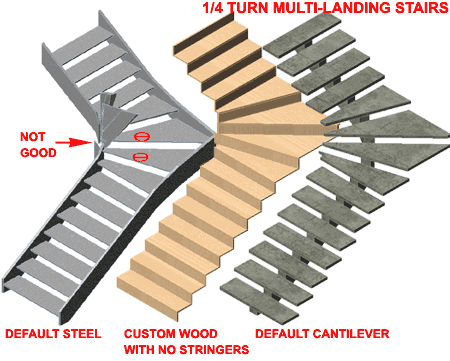 Turn", Stairs Illustrated to the right I show some three example 1/4 Turn Multi-landing Stair Shapes and how some Style features may cause Defect Warnings and incorrect 3D results such as that illustrated by the Default Steel Stair Style. Though you can work with Winder Styles, Edit Turns and even control the riser numbers at corners, these tools may not eliminate problematic results. Illustrated to the right I show how a custom Wood Stair Style, that has been simplified by eliminating all Stringers, produces no Defect Warnings like its Steel counterpart. I also show how another Style, like the default Cantilever, may help to resolve such issues. Though these may not produce the right results in Sections, Elevations or 3D Views, it may be the only way to get the right results in Plans. |