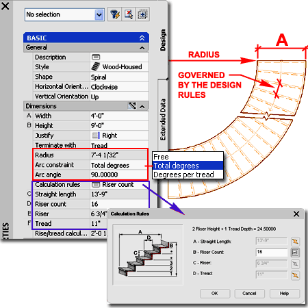 Arc Angle - only available for the Total Degrees and Degrees Per Tread Arc Constraints. See comments for Arc Constraints. Illustrated to the right I show that in addition to using the Arc Constraint options, you can also work with the Calculation Rules to control how your Spiral Stairs are constructed. True Spiral Stairs, for example, often use more Risers than the Rules may utilize so you can increase the number manually. And finally, you will also need to consider the role of the Design Rules tab under the Stair Style which, if poorly configured for Spiral Stairs, can cause you a lot of frustration. |