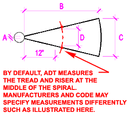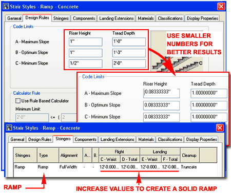 ![]() C - Minimum Slope - the minimum slope would be defined by the shortest Riser Height and the greatest Tread Depth you can use. Keep in mind that the Riser Height and Tread Depth values you set here are not necessarily the low end of possible results. In other words A, B and C are all ranges that can be combined so you could end up with a Minimum Riser Height with a Maximum Tread Depth or any possible numbers in between. Note: |