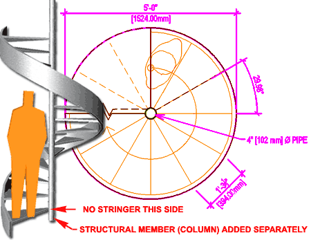 The 60" [1524 mm] Diameter Steel Spiral Illustrated to the right comes as close to the standard dimensional criteria set forth in many architectural guidelines. It is not perfect but I have honestly not been able to get a perfect one yet. One of the primary problems is that each tread is centered on the column so having a wider tread at the column is really not possible without having a wider column. My personal attitude is that I'd like to get close but will rely on shop-drawings to refine the details ( nonetheless, stair treads usually measure 22.5, 27 or 30 Degrees per tread and I only got 29.98 Degrees ). To create this type of result, confirm that you have a custom Stair Style and then set an appropriate Width ( Radius of full Stair - Radius of Column). On the Arc Constraint drop-down list, set this option to Free so you can type in the Radius of the center Column ( typically the diameter is 4" [394 mm] ). If you look at the results of this input under Arc Angle, Riser count, Riser and Tread, you can determine how close you are to what you really want and if you want to fine tune the results, you can either use the Calculation Rules dialog or the other Arc Constraint options. If you attempt to set the exact Degrees per tread, for example, you should find that the Radius will also change and that's where this games starts. Eventually the game gets old. |