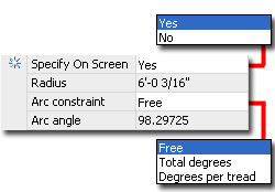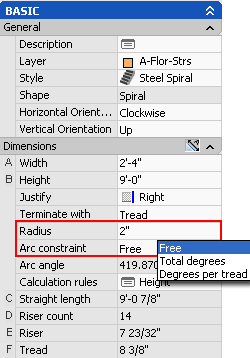 Spiral Stair Shapes are relatively easy to draw provided you are working with large radii. The trouble starts when you start to pull the radius closer and closer to the center to create actual spirals instead of simple circular stairs. I will discuss the true spiral stair below and focus on the basic concepts here. The Spiral Stair Shape offers unique settings that are all tied to the Arc Constraint options. This drop-down list offers three Arc Constraint options: Free, Total Degrees and Degrees Per Tread. When you select one of these constraints, you should notice that you will find different options as they relate to constraint type.