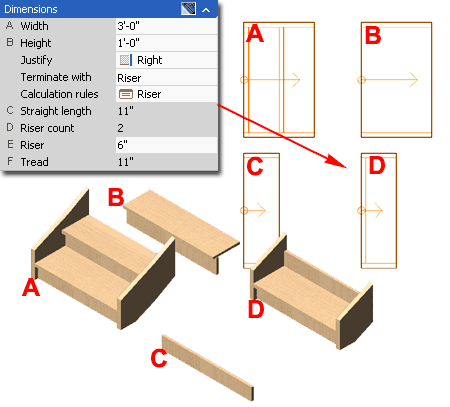 | Creating "Straight" Stairs Drawing the Straight Stair Shape is arguably the easiest stair to draw and you should not have any difficulty in getting this type of stair to display correctly for your projects. You may have to work on the Style to set Rise and Run rules or design related information but generally a Straight Run of Stairs should be straight forward ( pun intended ). Having said that, however, in the illustration to the right I show the one scenario for Straight Stair Shapes that I continue to find problematic: the single riser Straight Shape. For Stair "A", I show that a two riser Straight Stair is easy to create but once you attempt to create the single riser Straight Stair you may end up with "B" or "C" where display problems may occur in one or more Views. So far, the best and most consistent solution I have come up with for the single riser Straight Stair is illustrated as "D". For this solution, I limit the Riser Count to 2 and allow it to Terminate with a Riser. In Elevation View I then push the top Riser into my Floor Slab or equivalent Object so it disappears. It's not great but as you can see, "B", which looks correct in a 3D View, produces an erroneous result in Plan View.