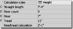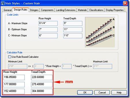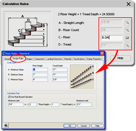 Styles - Design Rules tab - Calculator Rules In the discussion above we looked at the basic Code Limits which allow you to provide three ranges for the Slope of your Stairs. In reality you typically only need two ranges for the highest and the lowest and that is why you find that most of the default Stair Styles use the same value pairs for the Maximum Slope and the Optimum Slope. Having the Optimum Slope can prove rather useful in difficult residential design, however, where this point is hit if possible while allowing you tremendous freedom to adjust the default results via the Calculation Rules dialog on the Properties Palette. One problem with straight ranges is that sometimes two results are possible within the same range and you may prefer one over the other. To set rules for the Code Limits, you can employ an even more restrictive tool: the Calculator Rule. Calculator Rule: Minimum Limit <= [(N *