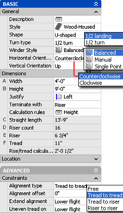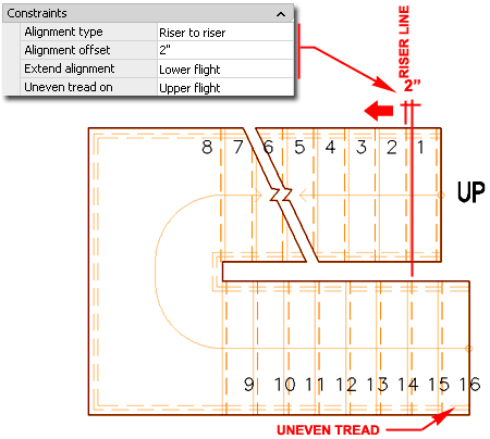 | Stair Properties - Constraints For U-shaped Stairs there are several Constraint options on the Properties Palette to assist in positioning the Riser alignment. Since you cannot use Grips to Stretch the Up or Down flights between the Landing, you will need to use the Constraints to adjust Riser positions and location of any uneven Riser count. Keep in mind that U-shaped stairs only have a limited amount of flexibility in Riser Position and if you desire a more staggered relationship between the Up and Down Risers, you may need to use a Multi-Landing Stair Shape or even two separate Stair Shapes that are Anchored to a Landing. For control over Riser position directly related to the Landing, see the Landing Extension options on the Stair Style's dialog box.