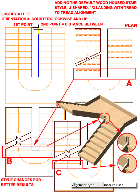 Once completed, I show the results of my Stair which has more graphical information than I care to show and the need for changes to the landing dimensions ( see "A" ). One way to change the graphical information is to choose another Display Configuration, like Medium Detail, or change the current Display Representation. For the Landing situation, I had to change the Stair Style's Landing Extension values in order to create the results that I show labeled as "B" where the Tread lines meet at the very edge of the Landing. In the 3D View, I show that though using a Tread to Tread Alignment Type for this example Stair produced a plausible solution in Plan View, it did not do so in 3D. To create a more plausible solution for the 3D View, I show that I changed the Alignment Type to "Riser to Riser" (see illustration, left). See below for more on Constraint options for U-shaped Stairs. |