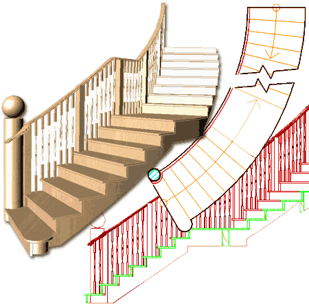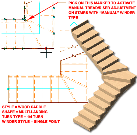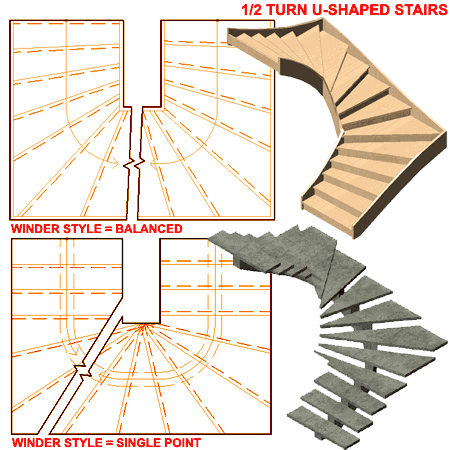 Illustrated to the right I show two examples of the U-shaped 1/2 Turn Stair Shapes using two different Winder Styles. In general, I do not find the 1/2 Turn Turn Type useful for any stairs existing or new that I come across. If you have a practical application for this type of Stair I'd like to hear about it just out of plain curiosity. In the illustration to the upper right I show what happens when you use the default Wood-Housed Style and the default Balanced Winder Style. This Stair is basically ludicrous so I also show my efforts to make something more practical. In the illustration to the lower right I show that I created a custom Winder Style using the Single Point Winder Type option. Since this combination of options produced nothing but Defect Warnings, I also changed the Stair Style to a Cantilever so there would not be any Stringer cleanup conflicts. Unlike the Balanced Winder Style, the Single Point left the side treads alone and only wound those around the landing as illustrated to the right. When working with these types of Stairs, keep in mind that you have some extra Modification tools such as the WinderTurnAdjust command and the Edit Turns Grip-like Marker. Also, when working with stairs that tend to create Defect Warnings, try to remove Nosing Values, Landing Extensions and even Risers for better results. |