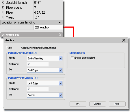 | Anchor dialog Once an Object such as a Stair has been Anchored to the Landing of a Stair, you will find that "Location" section of the Properties Palette will be replaced with an "Anchor" option as illustrated to the right. The Anchor dialog box provides options for controlling where the Anchored Object is positioned in the absolute X and Y planes By working with the "Position Along Landing (X)" and the "Position Within Landing (Y)" options you can make some adjustments to the position of the Anchored Object in the absolute X-Y Plane only. Notice that there is no option for a Z-axis position. End at same height - this checkbox option seems to have been designed for stairs that split in opposing directions, like a "Y" with a common landing in the middle; i.e., one stair is a Multi-Landing with a full height while the other is a Straight Shape Anchored to the lower Landing. With this Checkbox active, you can control both Stair Heights by working with the primary one. Note: |