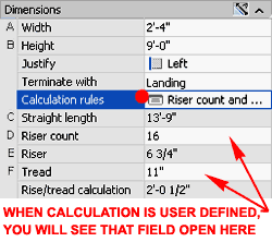 ![]() In the illustration above, I show an extreme case of restricting the Stairs to only follow one Rule as set by Maximum and Optimum Slope and the Calculator Rule. In this case, the Calculator rule simply guarantees that the Minimum Slope will never be used. If you draw Stairs with this configuration, all stairs whose Height is not divisible by 7" will result in Stairs with the Defect Warning marker. If you increase the Maximum Slope values, this Rule becomes a little more flexible while remaining fixed by the Calculation Rule of 25". Illustrated to the left I show how on the Properties Palette, under the Dimensions section, you can read the results of your Stair Design Rules. Note: |