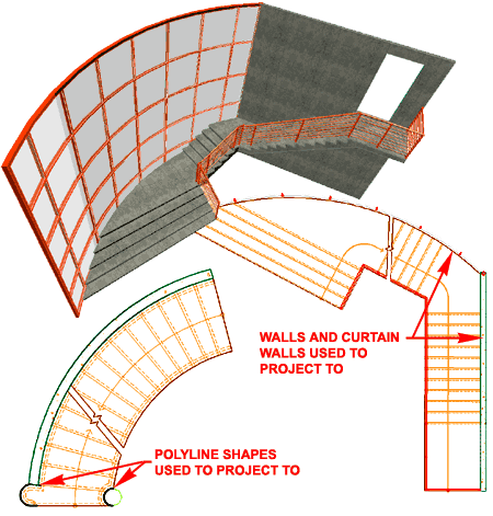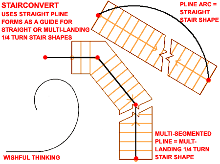 Another way to create Stairs is to use a command that has remained undocumented for quite some time now called Convert to Stair. The only way you can access this command is to type "StairConvert" on the command line. Once you have tried this command you may come to understand why this is the only way to access it. In the illustration to the right I show some examples of how this command reads Polyline Objects and what it creates as a result. For multi-segmented Contiguous Polyline shapes, the result is usually a Multi-Landing 1/4 Turn Stair Shape. For single Polyline shapes, including Arcs, the result is usually a Straight Stair Shape. You cannot use this command to create cool spiral/winding stair designs. For other Pline related options as they relate to Stair Shapes, see Customize Edges below. |