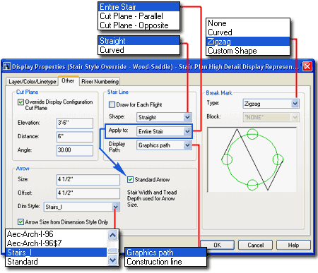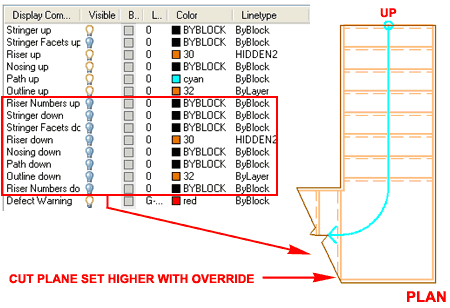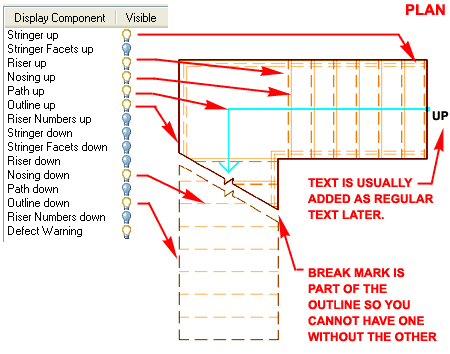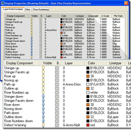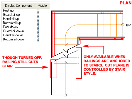 Since Railing Object Display Components have been divided in half under several of the Display Representations, it is fairly easy to turn the Visibility On or Off for all of the "Up" or "Down" Display Components as illustrated to the right. Notice, however, that if you turn Off the Visibility of a Railing but don't match that setting on the Stair, the Stair still gets cut by the Railing. To control the Zigzag Break Mark and the Cut Plane Height for the Railing, you must adjust these settings on the "Other" tab of the Stair's Display Properties dialog box - see Stairs Above and Below the Cutting Plane. |