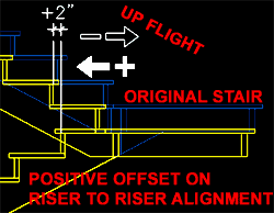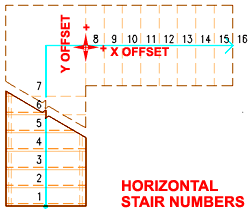 Alignment Offset - the distance you want your up Treads or Risers to vary from your down Treads or Risers with respect to the Alignment option. If you use Tread to Tread for an alignment, for example, and use 0" for the Offset value, then the Stairs should match on both sides of a U-shape. Use a positive number and the up flight moves forward of the down flight. Use a negative offset and the up flight moves backwards towards the landing with respect to the down flight. Be aware that as you move the up flight back and forth, the down flight will compensate with the gain or loss of an additional riser and the landing may also be adjusted to compensate for this change. Also, keep in mind that the down flight ( down from the landing to the floor ) remains static with respect to the insertion point while the top riser of the up flight will move freely. |