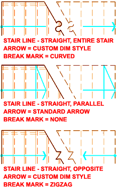 ![]() D - Total - this value field is not available for Saddled and Slab Stringer Types. Negative values are not allowed. E - Waist - this value field is not available for Saddled and Slab Stringer Types. This value affects Landings. F - Total - this value field is not available for Saddled and Slab Stringer Types. By working with large values you can use this option to create the appearance of Walls as illustrated above left ( example "A" ). This value affects Landings. Cleanup - this drop-down list offering two options is available for all Stringer Types. All of the default Stair Styles that come with ADT have this value set to "Truncate". I think the term cleanup connotes a confusing interpretation about the "Truncate" versus "Cleanup" options since truncate is typically what you will want to see. When you use the "Cleanup" option, you should find that Stingers do not actually clean up but extend fully beyond adjacent stringers at points like Landings ( in some cases this is actually more appropriate for true framing conditions but may produce more linework than you want to show in Plans ). Illustrated to the left and above I show a series of different Stringer Types and some corresponding values to create unique results. By using trial and error experiments on these options, you can come up with some pretty interesting results that will hopefully save you time and effort in your production drawings. |