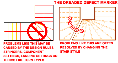 As you create Multi-landing stairs, pay close attention to the graphic display. If you pick beyond the rectangle and stair riser count, you won't have the opportunity to shape the stair with landings; i.e., you will just get a straight run. If you pick somewhere short of the stair's full run, you should notice that the Riser Count locks while you are able to draw the landing length and direction. Once you have picked a second point to form the landing, the Stair Riser count should begin to count again as you see risers form on the screen. Continue this procedure until you have run out of risers for the given height. The 1/4 Turn and 1/2 Turn Multi-landing Stairs do not have landings at the bend point but use a Winder Style instead to determine how the risers "turn" at the corner. When you specify 1/4 Turn or 1/2 Turn as the Turn Type, you should notice the option to select one or more Winder Styles. For these Stairs, simply pick a starting point, the bend or turn point and a final point out beyond the end of the full run. The 1/4 Turn Multi-landing Stair Shape will often produce one or more Defect Warnings due to problems with Stringer conflicts or Riser/Tread conflicts. See comments below for examples of Stringer changes. For Riser/Tread problems, I have found that reducing the Nosing Length to zero often resolves such conflicts. The 1/2 Turn Multi-landing Stair Shape appears to be a defective design option because I have yet to get this combination to produce anything but the result illustrated to the right ( Defect Warning ). |