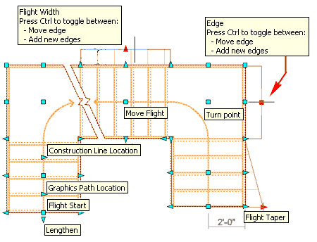 | Stair Grip Points Stair Objects, unlike many other Objects in ADT, have the fewest Grip Points in 3D Views so Plan View is where you will find the greatest number of things you can change through the use of Grips. Illustrated to the right I show a sample of the various Grip Points and options that you have for changing a Multi-Landing Stair Shape. Notice that some Grip Points offer options via the Ctrl key for Moving or Adding a New Edge. Be aware that not all Stair Shapes react the same way when working with specific Grip Points. U-shaped and Spiral Stair Shapes, for example, are more closely tied to their shape than Multi-Landing and Straight Shapes. If you accidentally use a Grip Stretch on a Stair object and create a non-linear edge, you can always come back and undo such a mistake with the Customize Edge, Remove customization option - see discussion above.