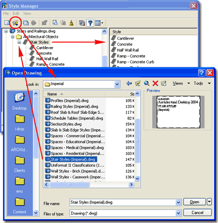 Styles (Imperial).dwg Illustrated above, I show how you use the Style Manager, filtered for Stair Styles, to Open the Stair Style template file from ADT's Styles folder. The process is much like Opening a drawing for editing. |